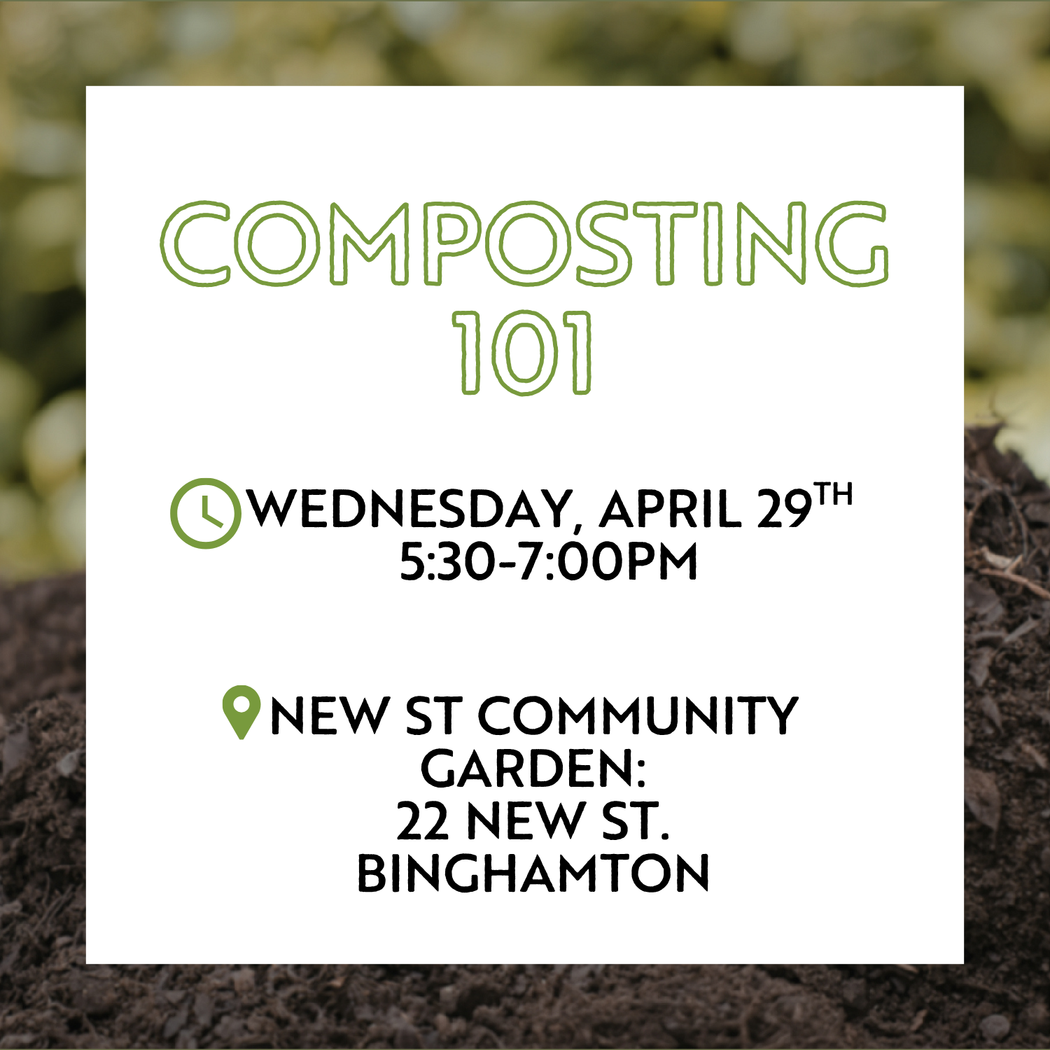Join us for a free composting workshop at the New St Community Garden! Learn the basics of composting, including how to start and maintain a compost pile, what materials to use, and how composting benefits your garden and the environment.
