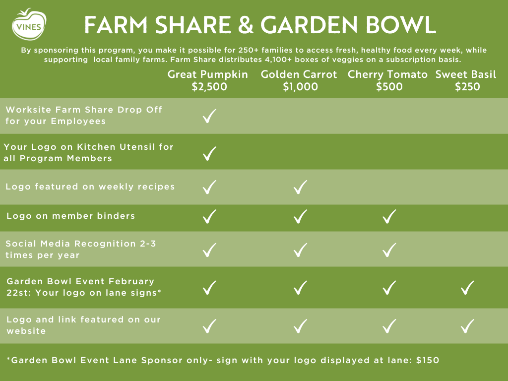 Join us for the 7th Annual Garden Bowl fundraiser for the VINES Farm Share program. This fun, family-friendly event is a great way to spend an afternoon bowling with friends and raising money for Farm Share.