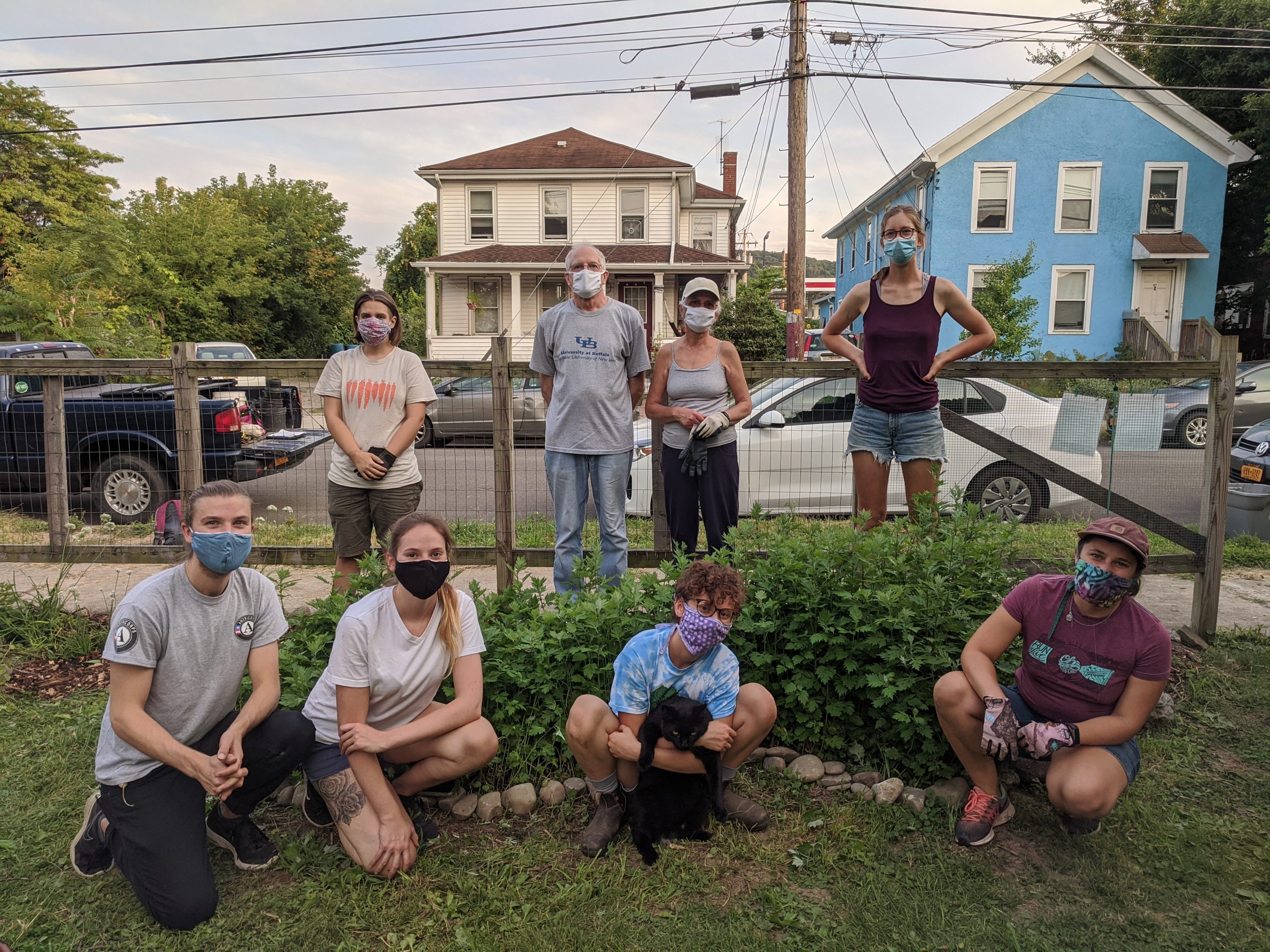 The Laurel Avenue Community garden was developed in partnership with the Binghamton University Price-Waterhouse Coopers Scholars. The site has 25 raised beds, a common space with ornamental plantings, perennial herbs and flowers, fruit trees and shrubs. Recent projects include a new arbor for vining plants and some weed-blocking paths designed to catch and redirect rainwater.
