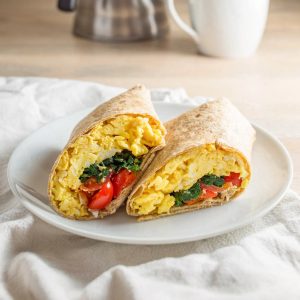 A quick and satisfying breakfast wrap filled with fluffy eggs, wilted spinach, juicy tomatoes, and tangy feta. Simple, wholesome, and perfect for an easy start to the day.
