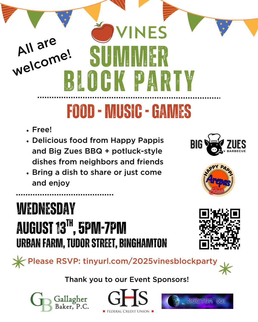 We’re celebrating the end of VINES’ Grow Binghamton Youth Program with a free, community-wide block party on 8/13 5-7pm! Enjoy delicious food from Happy Pappi and Big Zeus BBQ, plus potluck-style dishes from neighbors and friends. Bring a dish to share or just come and enjoy the good food, music, and company. Everyone is welcome. Please RSVP to help us get a headcount: tinyurl.com/2025vinesblockparty